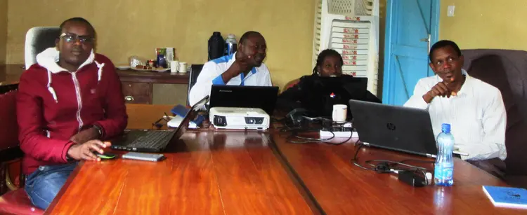 Bible Translators doing some checks with a consultant. From left: Kenford Mwĩti Mbaka, Justus Mũgambi Gĩtarĩ, Betty Kathure Mũtegi and lastly Jeremiah Okumu, A consultant in Biblical Greek.